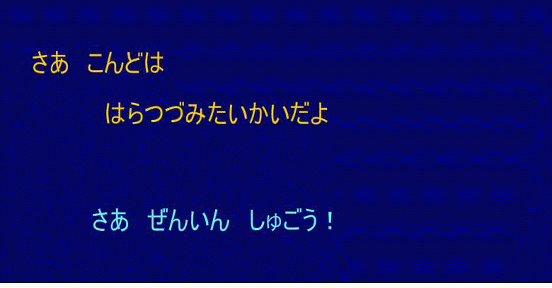 こんどは はらつづみ大会です。誰が一番上手にはらつづみをうてるのかな?