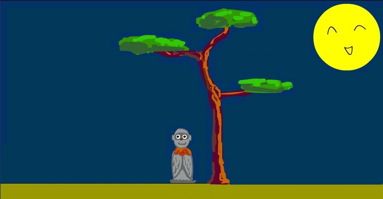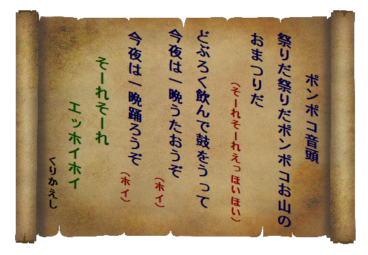 きょうは ポンポコ山のタヌキのおまつりです。みんなが お地蔵様のところに 集まってきます。